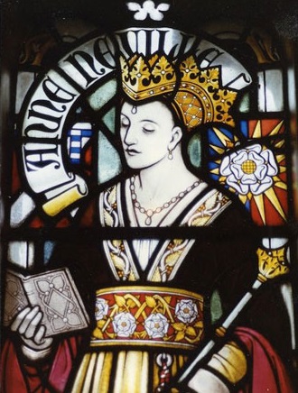 Stained glass image of Queen Anne found in Cardiff Castle, UK. 19th century.
